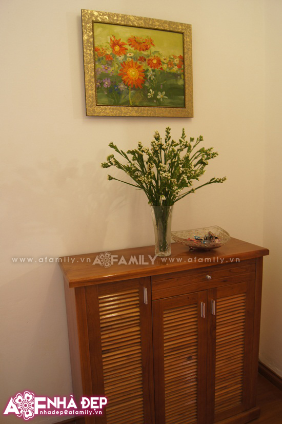 Mở cửa bước vào nhà, bạn sẽ thấy tủ đựng giày dép xinh xắn.